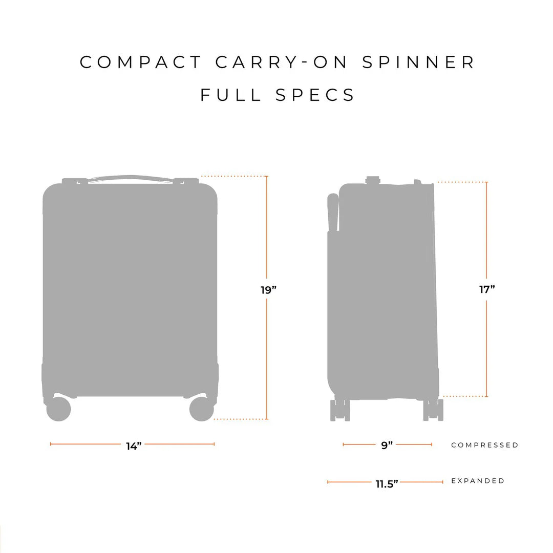 Perfect for short trips and frequent travelers, our Baseline 19” Carry-On Spinner is the compact carry-on with space to spare. With one button press, our CX® expansion system expands your packing space, but compresses to stay the perfect size for a luggage bin — all while keeping your clothes impeccably crisp. Anywhere you roam, it’s engineered for graceful movement and resilient performance, so you’re always ready for a new journey.