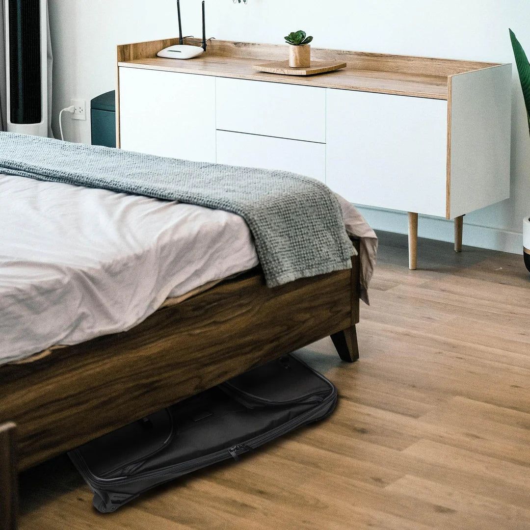 - Space-saving and easily foldable thanks to the removable side panel, this bag effortlessly stores under a bed or in a closet.